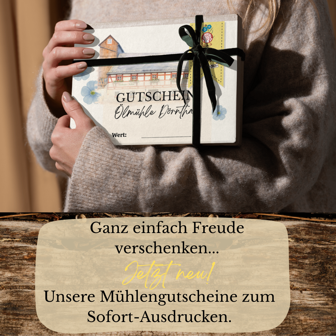 Ich bestelle mein Leinöl und andere Produkte seit einiger Zeit online in der Ölmühle Dörnthal. Dann hatte ich eine kleine Reklamation und habe das Produkt zurückgesendet. Postwendend kam ein Päckchen mit Ersatz und zwei äußerst großzügigen Zugaben. Es lag eine handgeschriebene Karte mit einer sehr freundlichen Entschuldigung bei. AUSSERGEWÖHNLICH! Also ist nicht nur Qualität sondern auch der Service sehr zu empfehlen! Sobald der Frühling kommt fahren wir mal hin.