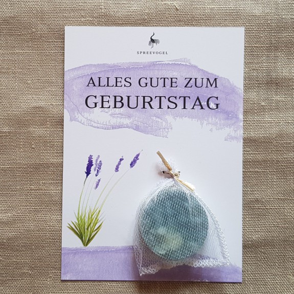 Karte ALLES GUTE ZUM GEBURTSTAG mit kleiner Seife Lavendel