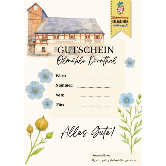 Bei Problemen mit dem Versand Ihres bestellten Gutscheins wenden Sie sich bitte an shop@oelmuehle-doernthal.de
